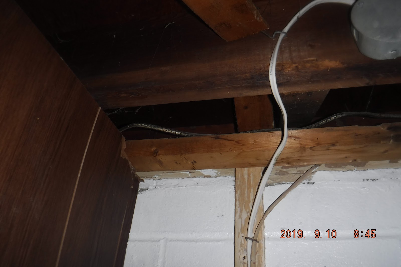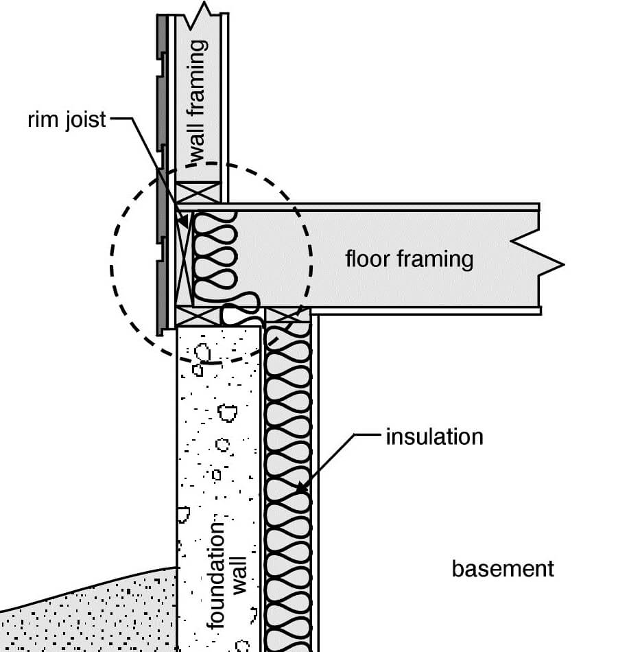 Next, I was curious about the basement.  A small utility closet revealed a 4' portion of the rim joist (at the top of the foundation wall) and it revealed that there was no thermal/pressure boundary (insulation).  Likely that was to be the case around the entire perimeter at the leaky rim and band joist, but accessing that area would be costly because the ceiling drywall would have to be removed.  It might be something that should be done if other possible remedies do not help with the moisture issue.  In any case, any accessible portion of the rim joist should be air sealed and insulated to the recommended levels in your area.  In Maryland it is R-19.  So, another likely source of humidity issues in this home was due to the infiltration of warm, humid air at the leaky portions of the rim joist.